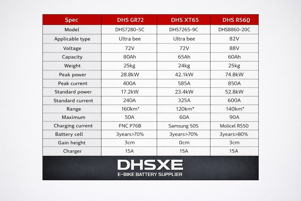 Upgrade your Ultra Bee with the DHSXE GR72 72V 80Ah lithium battery — built for long-range trail riding and everyday reliability. This pack delivers strong peak power without overheating, smoother acceleration, and consistent performance thanks to a high-quality FNC P76B cell design.